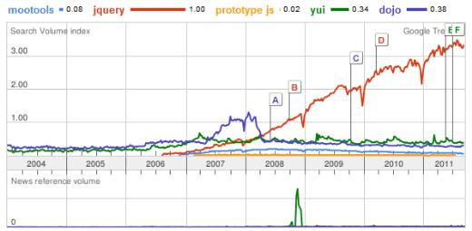 從上述圖我們可以看到j(luò)query遠(yuǎn)遠(yuǎn)領(lǐng)先于其他的js框架,排名第二的低了3個點(diǎn),形成了一邊倒的趨勢,老牌的js框架prototype由于使用困難和體積臃腫的原因一直使用率很低,而mootools本來一直以黑馬姿勢殺出,號稱輕量級并且速度快,但是由于jquery本身不俗的功力和眾多的插件,mootools也只能埋沒在jquery的光輝下面了。